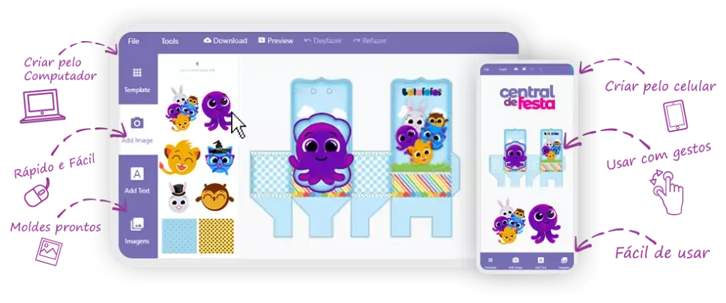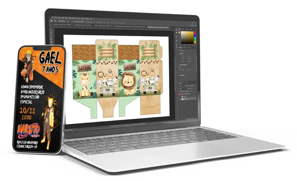 Faça lembrancinhas, convites, painéis, banners, sacolinhas para festas, faça anúncios ou postagens para redes sociais, serviços gráficos e muito mais.